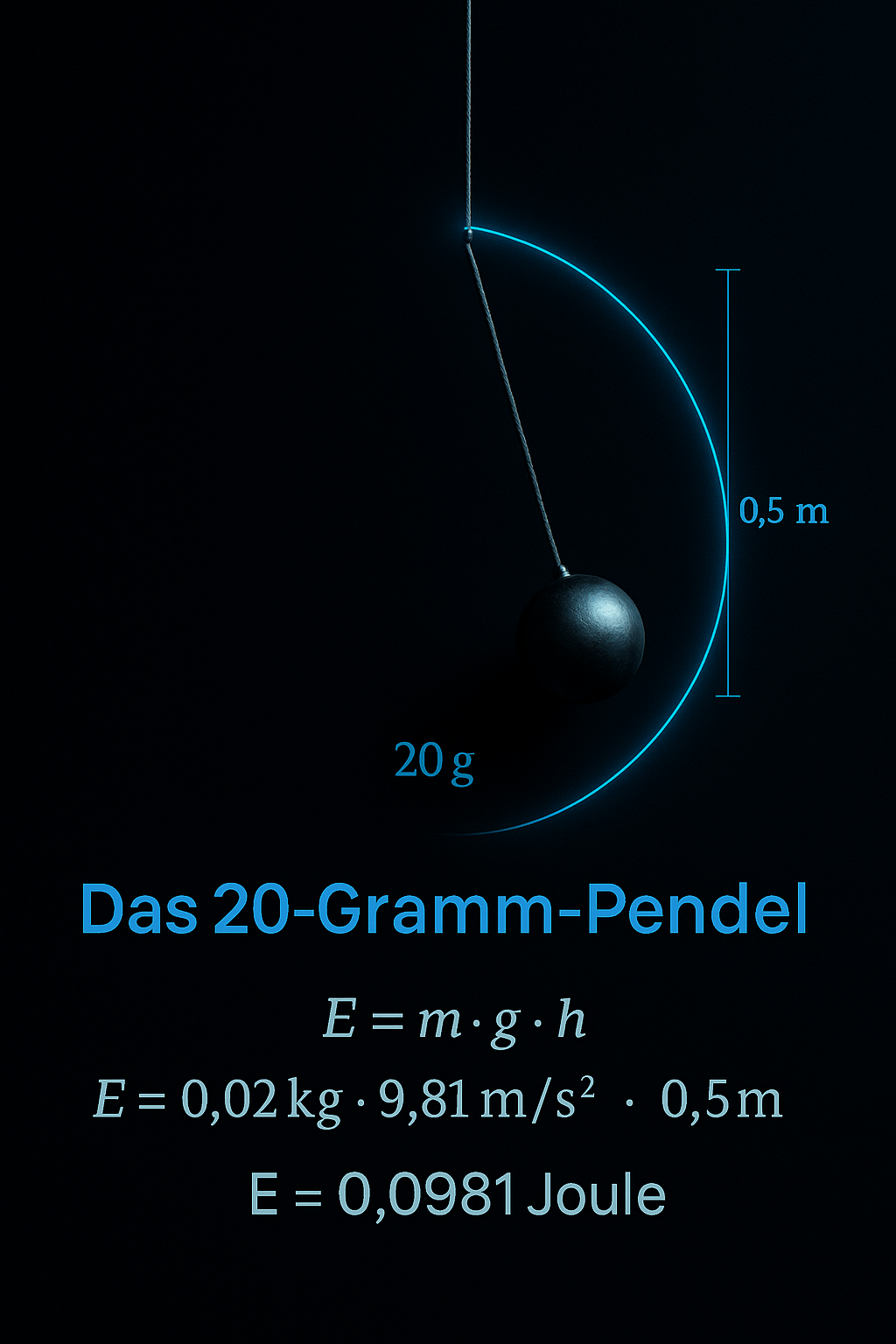 Eine 20g-Kugel, die über einen 3/4-Kreis schwingt, aus 0,5 m Höhe. Die potenzielle Energie berechnet sich nach der Formel: